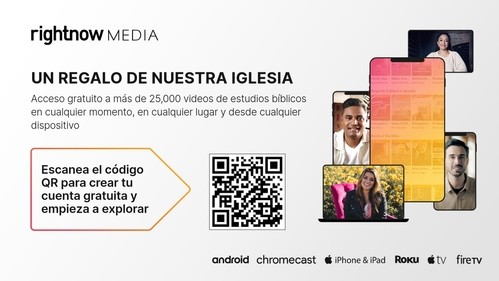Nuestra iglesia cree que RightNow Media es una herramienta que puede ayudarle a vivir su fe en cada área de su vida: en casa, en el trabajo y en su comunidad. Además de las series sobre libros de la Biblia, RightNow Media tiene videos para todos los miembros de su familia sobre una variedad de temas como el matrimonio, la paternidad, las finanzas personales, la salud mental y más. Incluso hay una biblioteca solo para niños con más de 2000 vídeos seguros y entretenidos. RightNow Media tiene una aplicación gratuita que está disponible en todos los principales dispositivos de transmisión para que usted y su familia puedan acceder al contenido en cualquier lugar y en cualquier momento.
